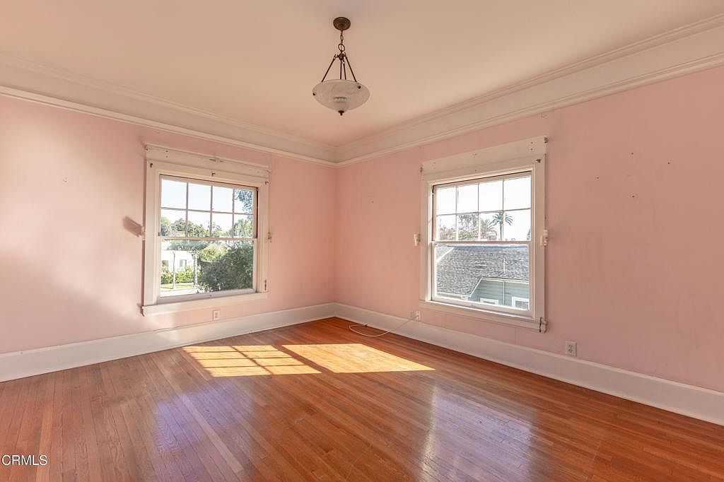This charming bedroom features soft pink walls that create a warm, inviting atmosphere. Ample natural light floods the space through two large windows, illuminating the rich, polished hardwood floors. The traditional crown molding adds elegance and enhances the room’s height, providing character and architectural interest. A vintage-style ceiling light fixture complements the room’s aesthetic while ensuring adequate illumination. With a generous layout, this room offers flexibility for various furniture arrangements, making it an ideal sanctuary for relaxation or study. The peaceful view from the windows invites a connection with the outdoors, enhancing the overall appeal.