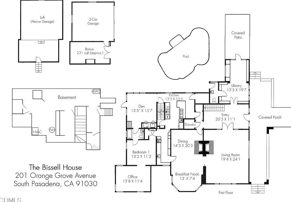 This detailed floor plan of The Bissell House reveals an elegant layout. Each space is thoughtfully designed with functional flow, showcasing a mix of open and distinct areas. The kitchen, featuring modern appliances and abundant cabinetry, seamlessly connects to a cozy breakfast nook. A spacious living room offers luxurious dimensions, perfect for gatherings. The dining area, with its generous size, invites formal entertaining. Beautiful high ceilings enhance the airy feel throughout, while large windows maximize natural light. Additional features include a covered patio by the pool, a den for relaxation, and a library that provides a quiet retreat.