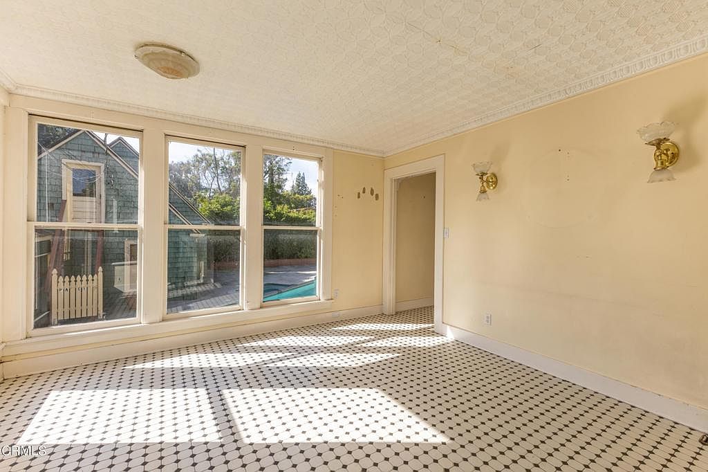 This charming sunlit room features a classic black-and-white checkered tile floor, creating a timeless elegance. Natural light floods through large windows, illuminating the soft yellow walls and highlighting the intricate patterned ceiling. The architectural details, including stylish wall sconces, add character and warmth to the space. The windows offer picturesque views of the lush outdoor landscape, making it an inviting setting for relaxation or entertaining. With its ample space and delightful light, this area can easily be transformed into a cozy sitting room, a cheerful breakfast nook, or even a multi-functional space, blending comfort with functionality.