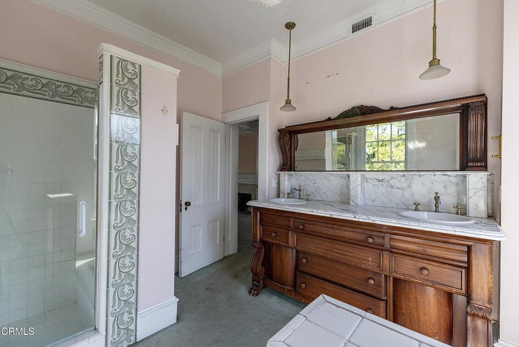 This luxurious bathroom exudes timeless charm with its delicate pastel pink walls that create a soothing atmosphere. A stunning wooden vanity, detailed with ornate carvings, complements the marble countertop, featuring dual sinks for convenience. The elegant mirror above reflects natural light, enhancing the space’s brightness. Delicate pendant lights illuminate the area, adding a touch of sophistication. The glass-enclosed shower is adorned with intricate decorative tiles, seamlessly blending functionality with style. With ample space and thoughtful design elements, this bathroom provides a serene sanctuary for relaxation, showcasing both elegance and practicality in its layout.