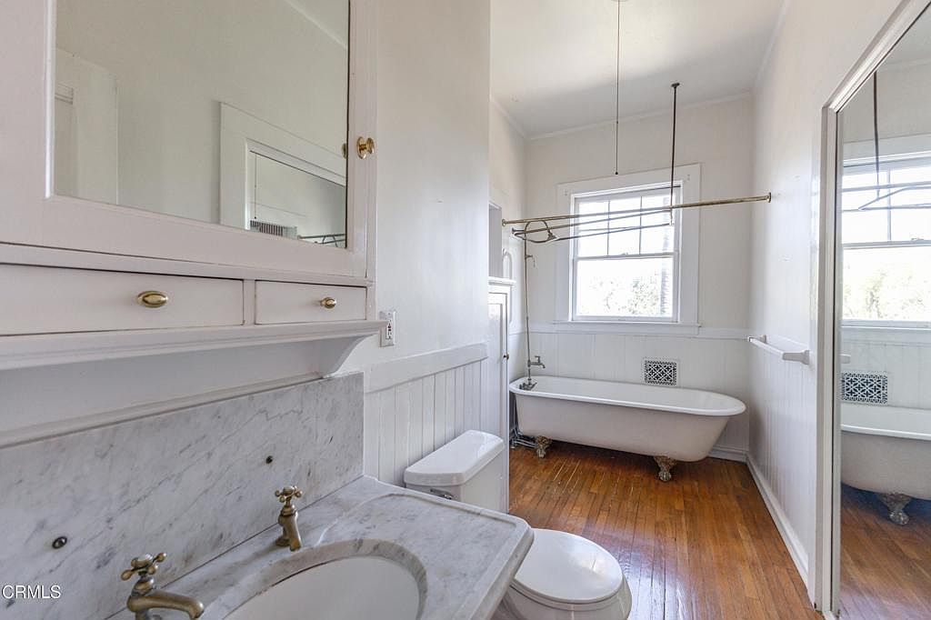 This charming bathroom features a classic clawfoot tub, accentuating a vintage, elegant aesthetic. Crisp white walls enhance the space, complemented by wainscoting that adds both character and texture. A marble countertop adorns the sleek vanity, highlighted by gleaming gold fixtures that evoke sophistication. Natural light floods the room through large windows, providing a bright and inviting atmosphere. The hardwood floor offers warmth and contrast against the lighter hues. Simple yet functional storage is provided by a mirrored cabinet, maintaining an uncluttered, serene environment. Overall, this bathroom balances traditional charm with modern functionality.