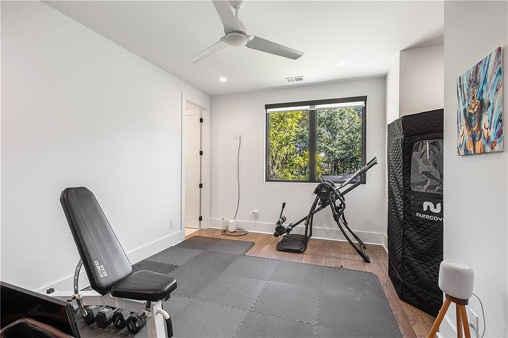 This thoughtfully designed home gym features an inviting layout that maximizes functionality and comfort. Walls painted in a crisp white provide a bright, airy atmosphere, complemented by sleek hardwood flooring that enhances warmth. A large window invites natural light, framing views of lush greenery, creating a serene workout environment. The room is equipped with essential fitness equipment, including a bench and an inversion table, ensuring versatility for various exercises. Minimalist decor, such as a vibrant art piece, adds a personal touch. Ample overhead lighting and a ceiling fan combine practicality with style, completing this ideal space for fitness enthusiasts.