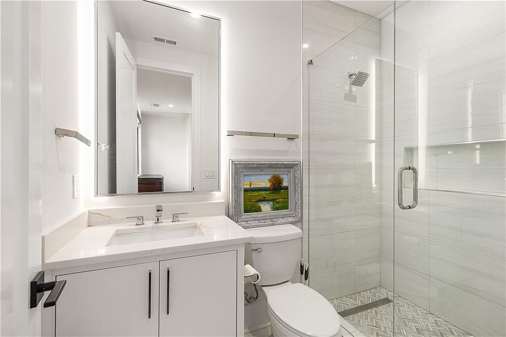 A contemporary bathroom featuring sleek lines and a minimalist design. The large, illuminated mirror enhances the sense of space while providing ample light. A spacious vanity with white cabinetry and chrome fixtures offers both style and practicality, complemented by a subtle marble countertop. The glass shower enclosure showcases modern tile work and a sophisticated chrome showerhead, ensuring an upscale bathing experience. Neutral tones create a calming atmosphere, while the textured floor tiles add interest. An elegant framed piece of art introduces a splash of color, completing this serene retreat for relaxation.