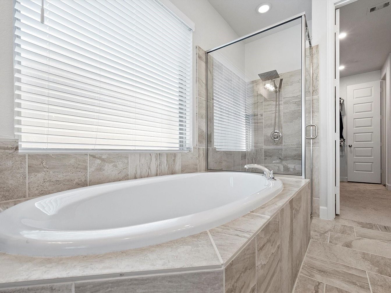 This bathroom features a large, built-in soaking tub with smooth white porcelain surrounded by neutral-toned tile in shades of beige and light gray with subtle veining. Adjacent to the tub is a glass-enclosed walk-in shower with a modern rain showerhead and chrome fixtures that complement the tub’s faucet. The window above the tub is dressed with white horizontal blinds, allowing natural light to softly filter in while maintaining privacy. The flooring continues the tile motif, contributing to a cohesive, clean, and contemporary aesthetic throughout the space. The doorway leads neatly to a carpeted hallway, adding warmth beyond the crisp bathroom.