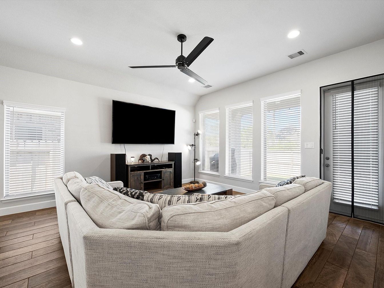 This living room features a spacious, light beige sectional sofa arranged in a cozy U-shape, inviting conversation and comfortable viewing of the large flat-screen TV mounted on the wall. Walls are painted white, creating a bright, airy ambiance amplified by the natural light streaming through multiple large windows outfitted with white blinds. The flooring consists of warm-toned wood planks, enhancing the space’s welcoming feel. A minimalist ceiling fan in black contrasts subtly with the white ceiling, complemented by recessed lighting fixtures that provide even illumination. The entertainment console below the TV is rustic wood, adding a touch of texture to the otherwise sleek and modern decor. Sliding doors with mesh screens offer access to an outdoor area while maintaining the clean aesthetic.