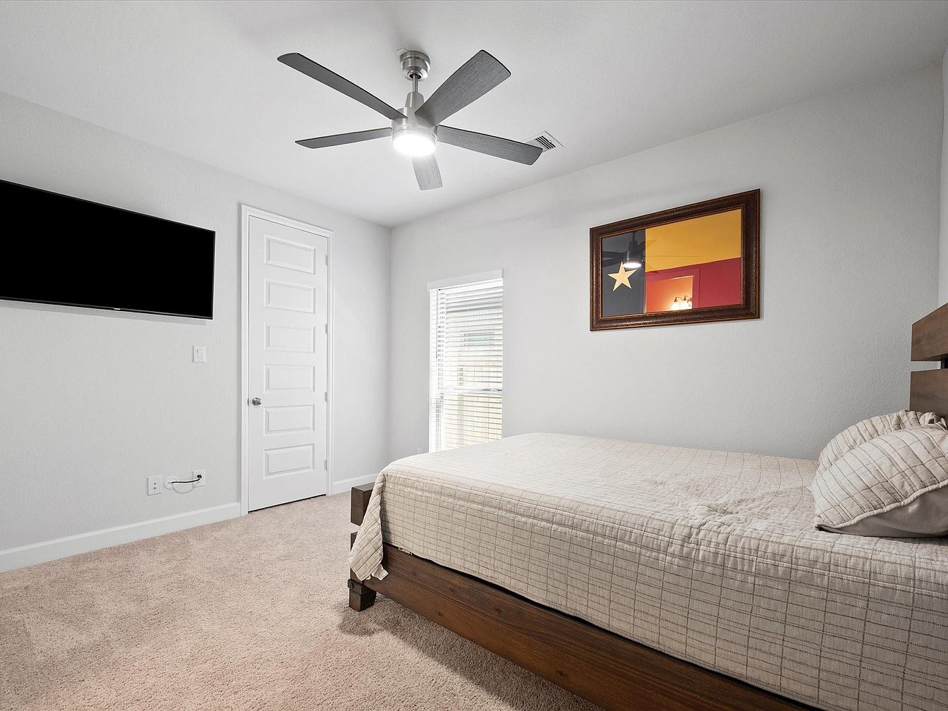 This cozy bedroom features a neutral color palette with soft beige carpeting and light gray walls, creating a calm and inviting atmosphere. A wooden bed frame with matching bedding in subtle checked patterns adds warmth and texture. A ceiling fan with modern, silver blades provides both illumination and air circulation, centered above the bed. A flat-screen TV is mounted on one wall, neatly positioned for comfortable viewing. Natural light streams in through a small window with white blinds, while a distinctive framed artwork with bold colors and a star motif brings a splash of character to the otherwise minimalist space.