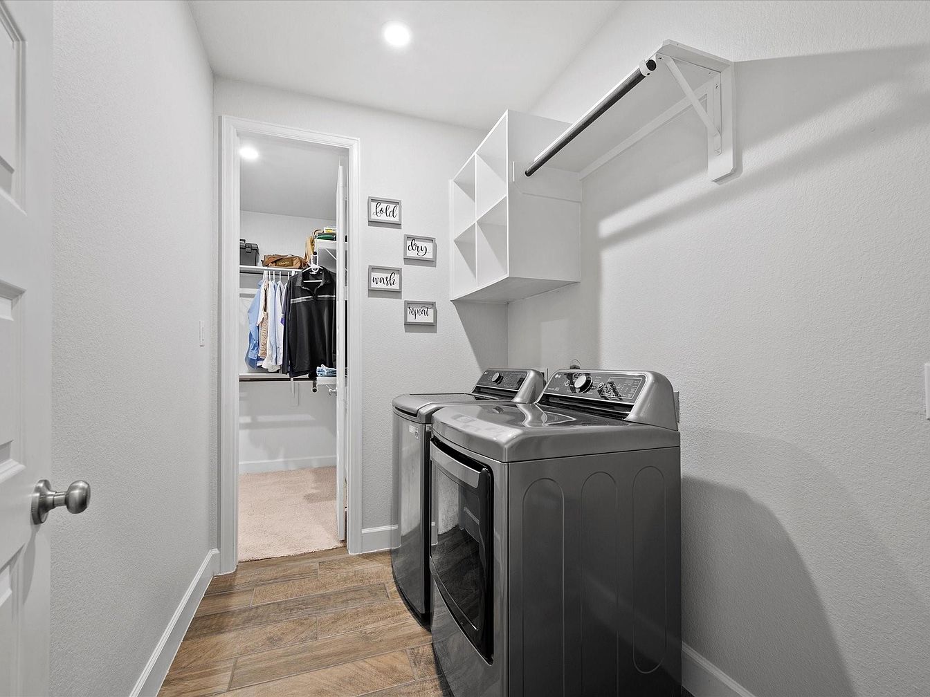 This compact laundry room features modern stainless steel washer and dryer units positioned side-by-side against a clean white wall. Above the machines, a white shelving unit with four cubbies offers storage, while a simple hanging rod extends for air-drying clothes. The room is illuminated by a recessed ceiling light, enhancing the bright, crisp atmosphere accentuated by white walls and a warm wood-tone floor with plank-style tiles. A doorway leads to a walk-in closet with hanging clothes visible, integrating everyday functionality with streamlined organization in a minimalist, practical design.