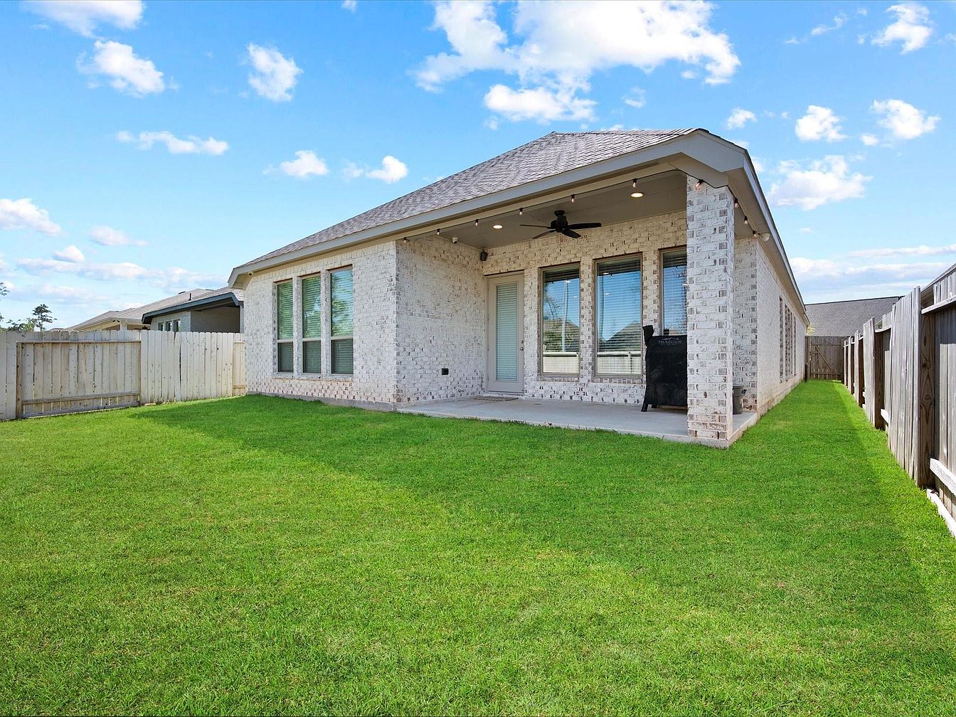 This outdoor space features a spacious covered patio attached to the back of the home, offering shelter and comfort for relaxation or entertaining. The patio ceiling includes recessed lighting and a black ceiling fan, providing functional illumination and air circulation. The house’s exterior showcases a light, whitewashed brick finish, contributing to a clean and modern aesthetic. Multiple large windows and a glass door open from the home to the patio, allowing natural light to flow indoors. The lush, well-maintained green lawn surrounds the patio, enclosed by wooden fencing for privacy. The overall design invites outdoor enjoyment with a mix of simplicity and charm.