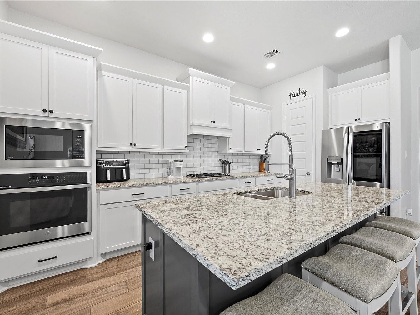This kitchen centers around a spacious granite-topped island with a built-in stainless steel sink and a contemporary high-arc spring coil faucet, perfect for meal prep and casual dining. Four cushioned stools with nailhead trim invite gathering and comfort. Crisp white cabinetry with simple black knobs and pulls provides ample storage, while the white subway tile backsplash adds timeless charm. Stainless steel appliances, including a built-in microwave, oven, and double-door refrigerator with ice dispenser, contribute to the sleek look. Warm wood-look flooring ties the clean, bright space together with subtle contrast and natural texture.