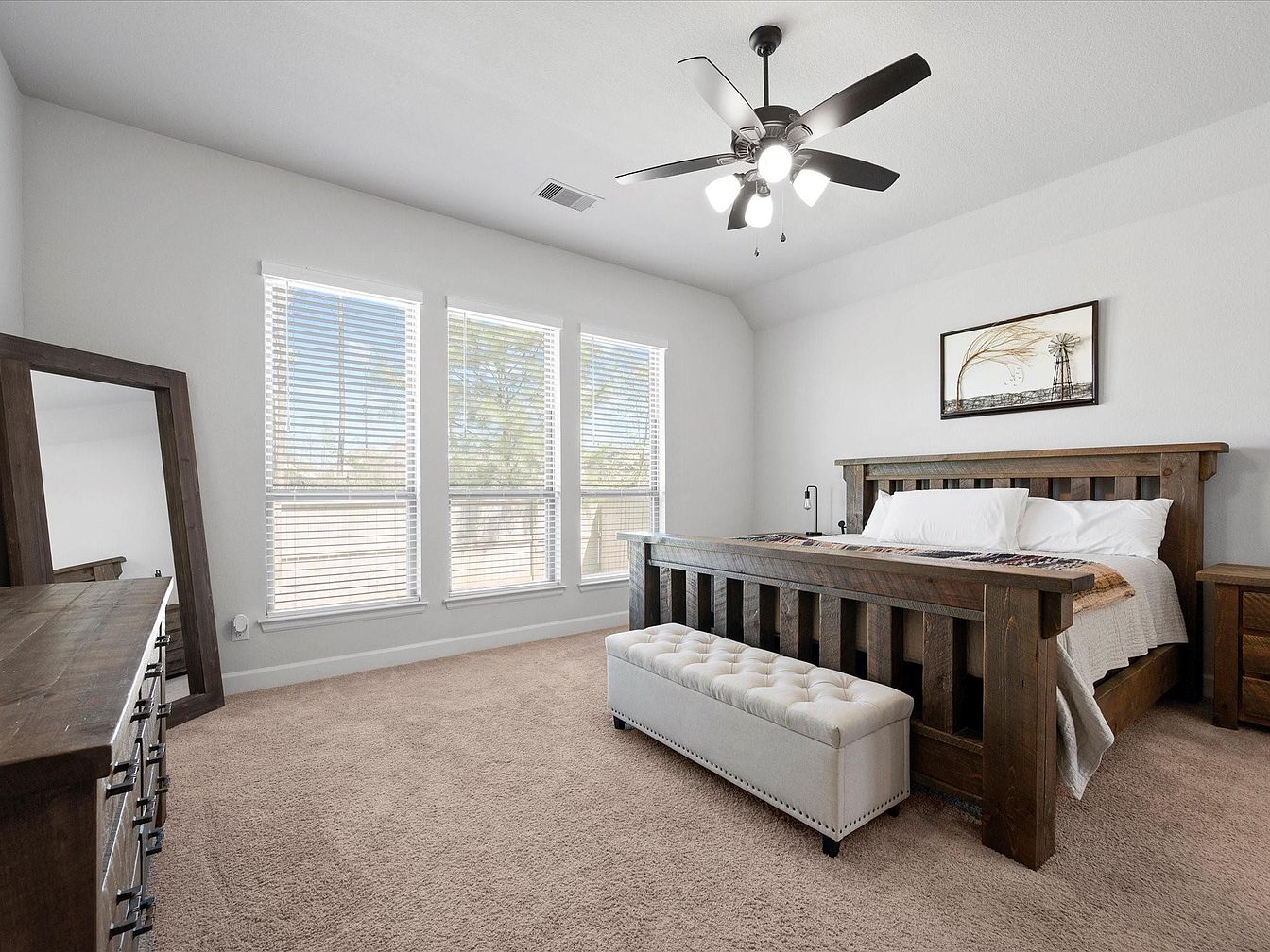 This spacious master bedroom features a neutral color palette with soft beige carpeting and crisp white walls that enhance natural light from three large windows. The room centers around a sturdy, dark wood bed frame with clean, rustic lines, complemented by a matching nightstand and dresser. A tufted, light-colored bench sits at the foot of the bed, adding texture and function. The ceiling fan with black blades provides both comfort and modern contrast. A full-length mirror leans against the wall, enhancing the sense of space, while minimal wall art above the bed adds subtle character without overwhelming the tranquil and inviting atmosphere.