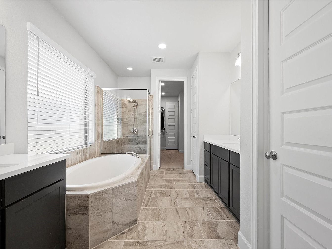 This beautifully presented home in Conroe, TX, located in the highly sought-after Grand Central Park community, showcases a modern architectural style with a charming mix of light-colored brick and stone facade. Though the exact year of construction is not specified, the contemporary design and immaculate condition suggest recent development or renovations. Priced at $445,000, this spacious residence offers 4 bedrooms and 3 bathrooms. The interior boasts impressive 12-foot ceilings in the entryway and 10-foot ceilings throughout the open-concept kitchen, dining, and living areas, enhancing the sense of space and brightness. The primary suite features a luxurious bathroom with dual vanities, a garden tub, and a glass-enclosed shower, alongside a closet connected directly to the utility room for added convenience.