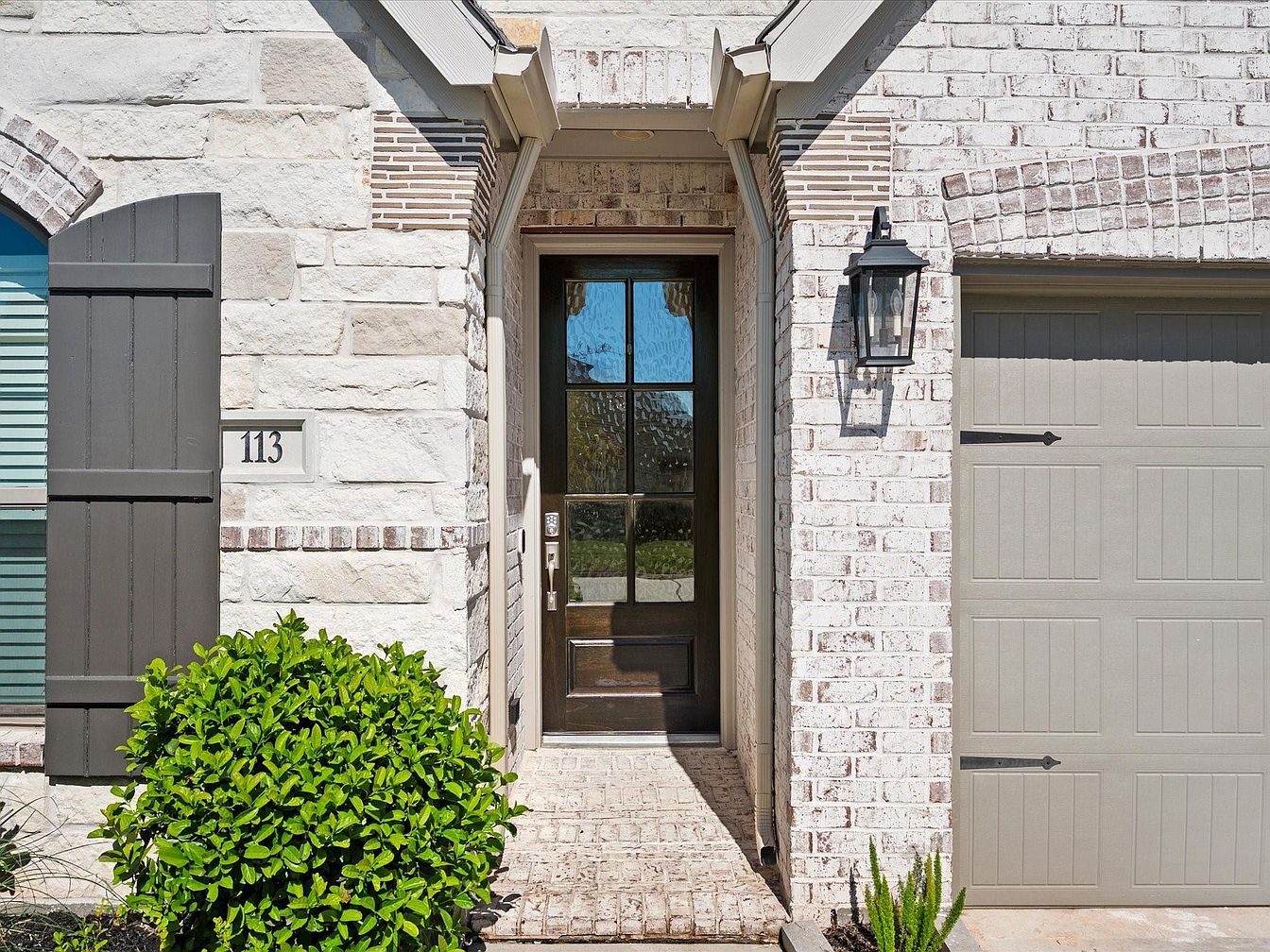 This welcoming front entrance features a sturdy dark wooden door with six rectangular glass panes, allowing natural light to filter through while maintaining privacy. The exterior walls combine creamy white stone and whitewashed brick, creating a textured and harmonious façade. To the left, a dark, shutter-style accent frames a tall window with horizontal blinds, contrasting nicely with the lighter stone. A classic black lantern-style light fixture adds a touch of traditional charm next to the door. The neutral-toned garage door to the right complements the overall color palette, while green shrubbery softens the stonework and brings life to the entryway.