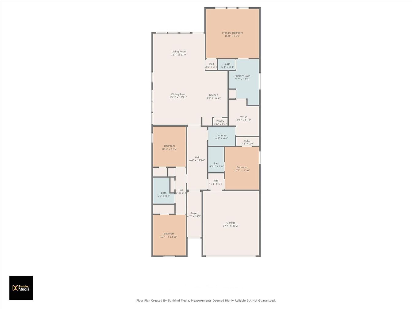 This detailed floor plan highlights a well-organized single-level home featuring three bedrooms and three bathrooms. The primary bedroom with a spacious walk-in closet and primary bath is positioned at the rear for privacy. The living room and dining area create a large, open-plan space perfect for family gatherings. The kitchen is conveniently located adjacent to the dining area and includes a pantry for added storage. Multiple hallways connect bedrooms and bathrooms efficiently, while a laundry room provides utility access. The attached two-car garage offers direct entry through the foyer, enhancing functionality and flow within the home.