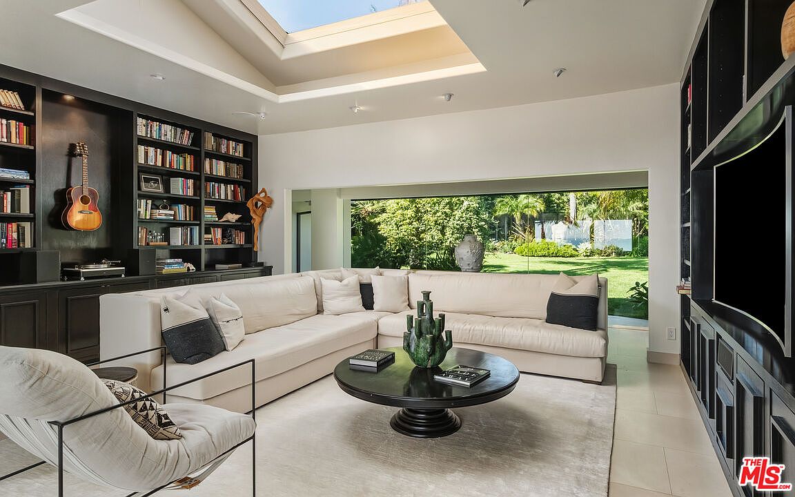 This stunning living room features a spacious layout with a modern, minimalist design. The soft beige sectional sofa invites relaxation, while a chic black coffee table serves as a focal point. Natural light floods the space through a large window and skylight, enhancing the airy atmosphere. Eye-catching built-in bookshelves create an inviting library feel and hold an array of books and decor. Elegant details include an acoustic guitar on the wall, adding a personal touch. Surrounding greenery is visible through the expansive glass, effortlessly blending indoor and outdoor living. A perfect blend of comfort and sophistication.